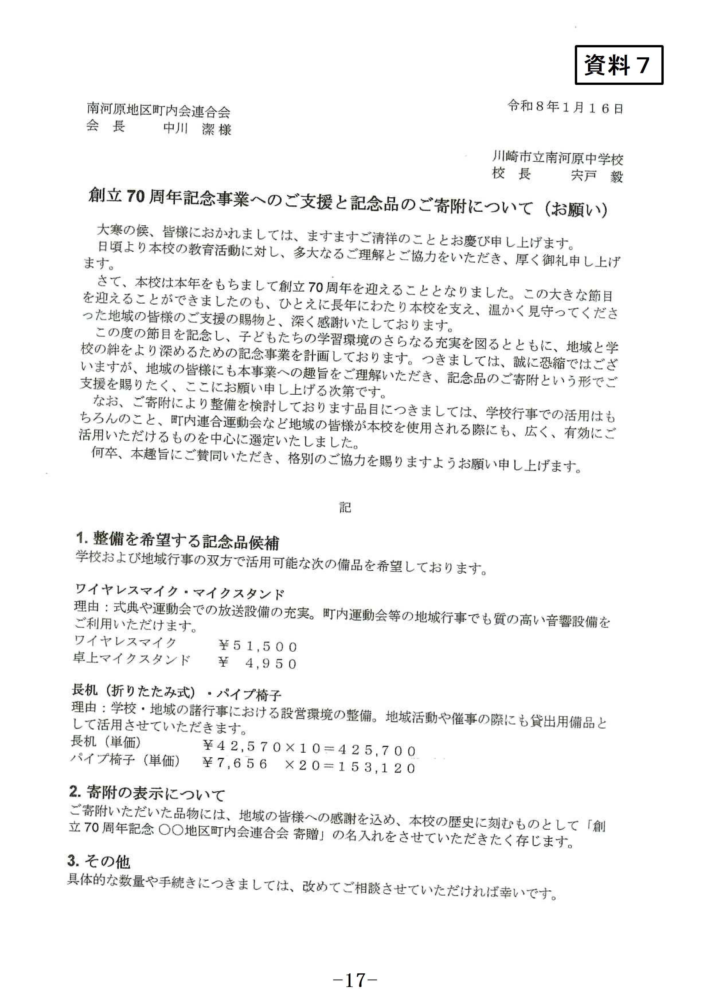 南河原中学校 創立70周年記念事業への支援と寄附について